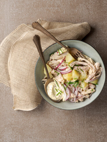 2 Spolverizzate con i semi di papavero. Frullate il succo del limone con sale, pepe, 5 cucchiai di olio e la cipolla e condite l'insalata.