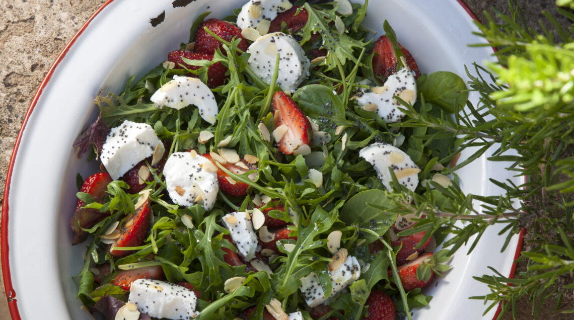 1  Tostate le mandorle in padellino. Tagliate le fragole a metà. Riunite in una ciotola la rucola, le fragole, le mandorle e il formaggio a pezzetti.