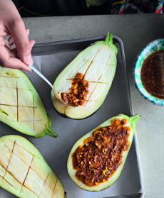 Tritate finemente l'aglio e la buccia di limone in salamoia e mescolateli con il cumino, il coriandolo macinato, il peperoncino, la paprica e mezzo cucchiaino di sale. Diluite con l'olio e mescolate bene. Tagliate a metà le melanzane nel senso della lunghezza. Incidete la polpa con tagli diagonali profondi e coprite la superficie con la salsa preparata facendola penetrare leggermente nei tagli. Disponete le mezze melanzane in una teglia con la parte tagliata verso l'alto e infornatele a 180° per 40 minuti.