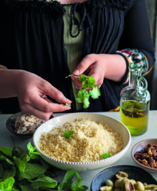 Intanto, mettete l'uvetta a bagno in una ciotolina di acqua per 10 minuti e poi scolatela. Tagliate a metà le olive. Mondate e affettate finemente i cipollotti. Tostate le mandorle in un padellino senza condimento. Cuocete il cous cous, poi mescolatelo con le foglie di menta e di coriandolo spezzettate e gli ingredienti preparati. Poi conditelo con l'olio, sale e il succo di limone.