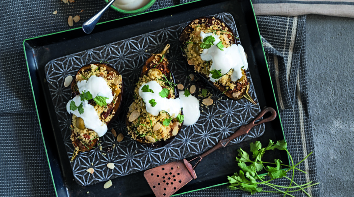 Togliete le melanzane dal forno, disponetevi sopra il cous cous e completate con un po' di yogurt e foglie di prezzemolo spezzettate. Servitele caldo o a temperatura ambiente.