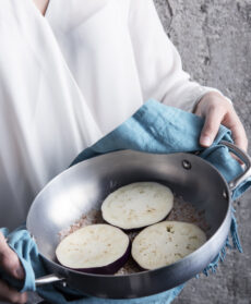 Lavate le melanzane e tagliatele a fette di 6-7 mm. Mettete un leggero strato di sale grosso in una padella antiaderente e fatelo scaldare per 2 minuti. Adagiate le fette di melanzana sul sale e fatele cuocere 3 minuti per lato a fiamma vivace; toglietele dalla padella, eliminate eventuali grani di sale e appoggiatele su una teglia rivestita di carta da cucina. Se durante la cottura il sale si riduce ripristinatelo in modo che ce ne sia sempre un leggero strato che ricopre tutto il fondo della padella, ma attendete sempre che si sia riscaldato bene prima di proseguire la cottura. Sgocciolate bene la mozzarella e tagliatela a fettine sottili.