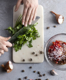 Tritate finemente lo scalogno e, grossolanamente, i capperi; lavate i datterini e tagliateli a cubetti molto piccoli. Riunite tutti questi ingredienti in una ciotola, unite l'aceto balsamico, il succo e la scorza del limone, il peperoncino, l'aglio spremuto, il prezzemolo e l'olio e mescolate molto bene.