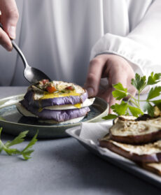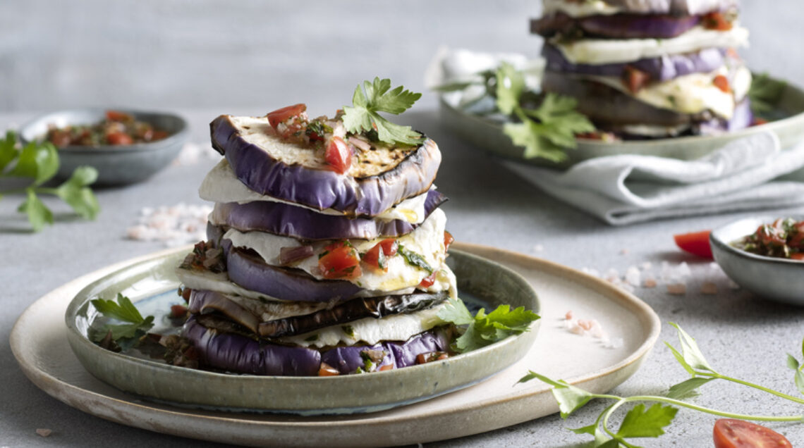 In ciascun piatto singolo formate 1 torretta alternando fette di melanzana, salsa e fettine di mozzarella. Completate con 1 cucchiaio di condimento e servite.