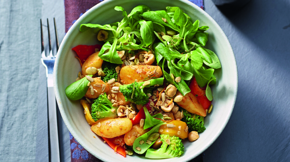 Verdure, crude e cotte, insaporite dalla nota croccante del mix di fiocchi d'avena, semi e nocciole. Come contorno o leggero secondo vegetariano