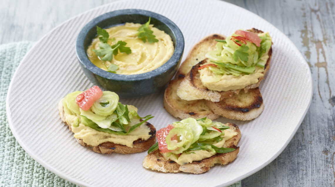 Da gustare come contorno o anche come antipasto, queste bruschettine con puntarelle, hummus di ceci e pompelmo sono una proposta ideale contro l'afa estiva