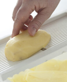 Sbucciate le patate e lavatele bene. Asciugatele con carta da cucina, poi tagliatele a fettine molto sottili con una mandolina o un coltello affilato. Immergetele in una ciotola d'acqua fredda, per eliminare l'amido in eccesso. Sgocciolatele e stendetele su un telo ad asciugare.
