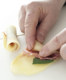 Disponete le fettine di patata sul piano di lavoro, distribuite su ciascuna una piccola fettina di prosciutto privato dell'eventuale grasso e completate con una foglia di salvia lavata e asciugata. Arrotolatele a involtino e fissatele con lunghi stecchini di legno.
