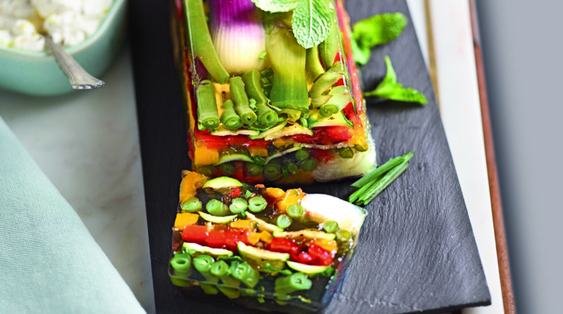 3 Scolate, sciacquate e tritate i capperi con le erbe aromatiche. Riempite lo stampo, alternando strati di verdure, erbe aromatiche e gelatina; terminate con quest'ultima, quindi trasferite lo stampo in frigo per almeno 4 ore. Sformate l'aspic di verdure e servitelo con la robiola amalgamata con sale, la scorza di mezzo limone grattugiata e la panna semi montata.