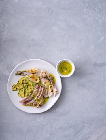 1 Mondate e lavate tutte le verdure, poi mettete a mollo i capperi in acqua calda per 20 minuti. Spennellate i peperoni con poco olio e fateli abbrustolire sotto il grill del forno, rigirandoli su tutti i lati. Trasferiteli in una ciotola, copriteli e lasciateli raffreddare. Scottate i cipollotti per 2 minuti in acqua salata in ebollizione, tagliate le zucchine nel senso della lunghezza a fettine di 3 mm di spessore e cuocetele su entrambi i lati sulla piastra. Cuocete i fagiolini in acqua salata in ebollizione per 7-8 minuti; pelate i peperoni, eliminate semi e filamenti, tagliateli a striscioline e stendetele ad asciugare su carta da cucina.