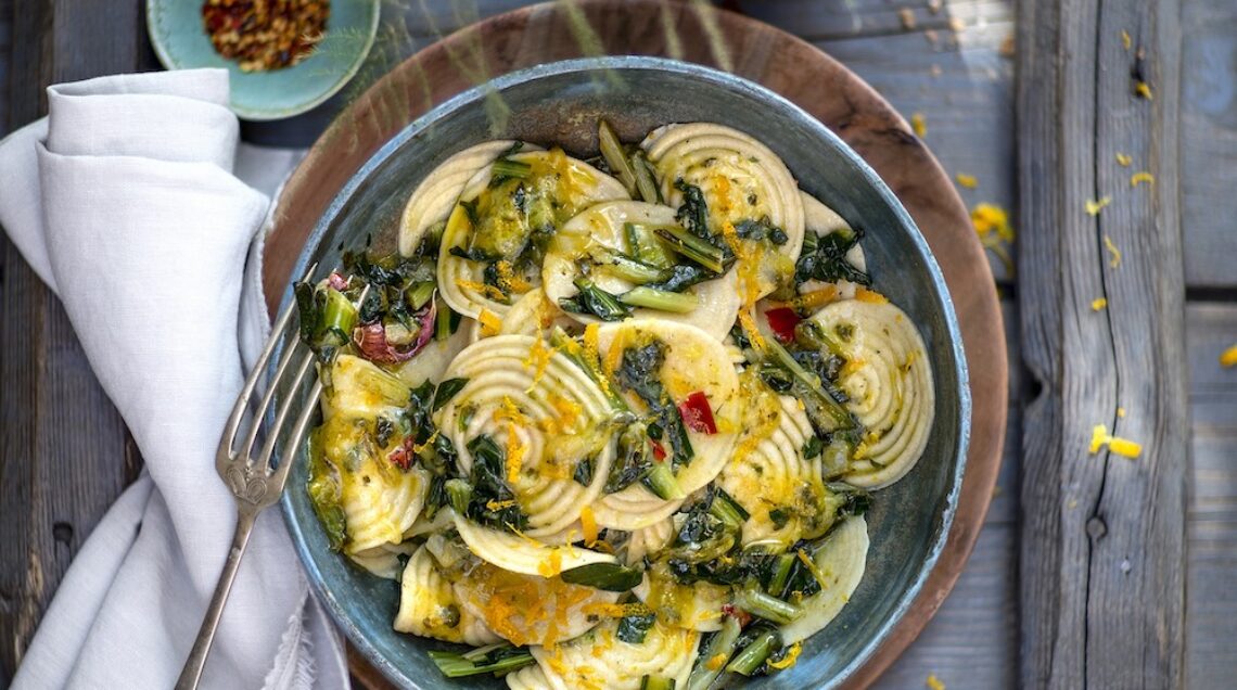 2) Mondate la catalogna e cuocetela in acqua bollente salata per 10 minuti; sgocciolatela e strizzatela bene. Sciogliete metà del burro con un pizzico di peperoncino e lo spicchio d'aglio sbucciato in un'ampia padella e fate soffriggere qualche istante; eliminate l'aglio e unite la catalogna tagliata a tocchetti. Cuocete per qualche minuto, profumate con un po' di scorza di arancia grattugiata e bagnate con il succo di mezzo frutto; salate.