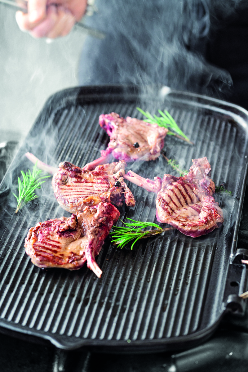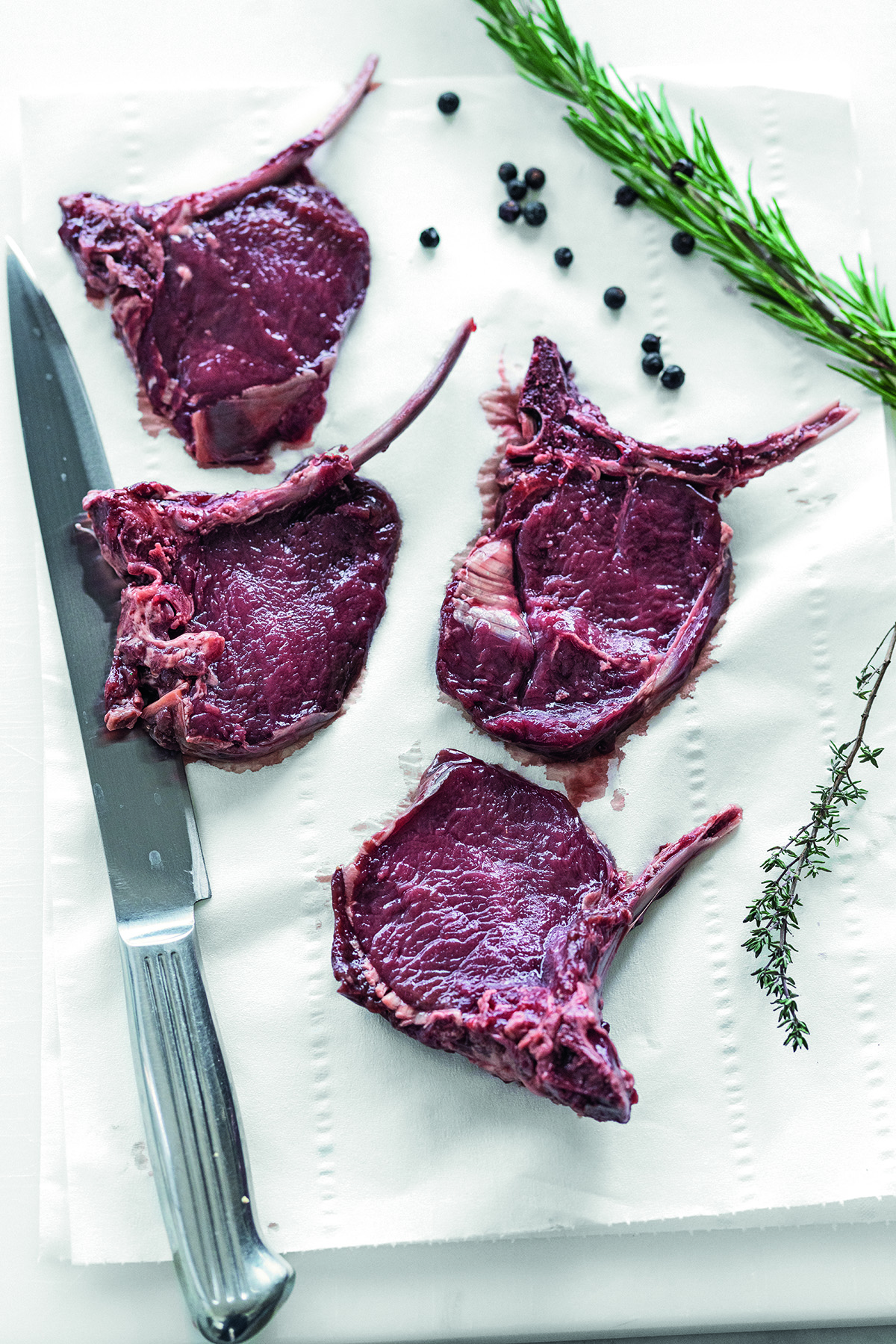 1) Pulite le costatine mettendo da parte gli scarti. Fatele marinare con olio, sale, rametti di timo e rosmarino e bacche di ginepro per circa 2 ore.