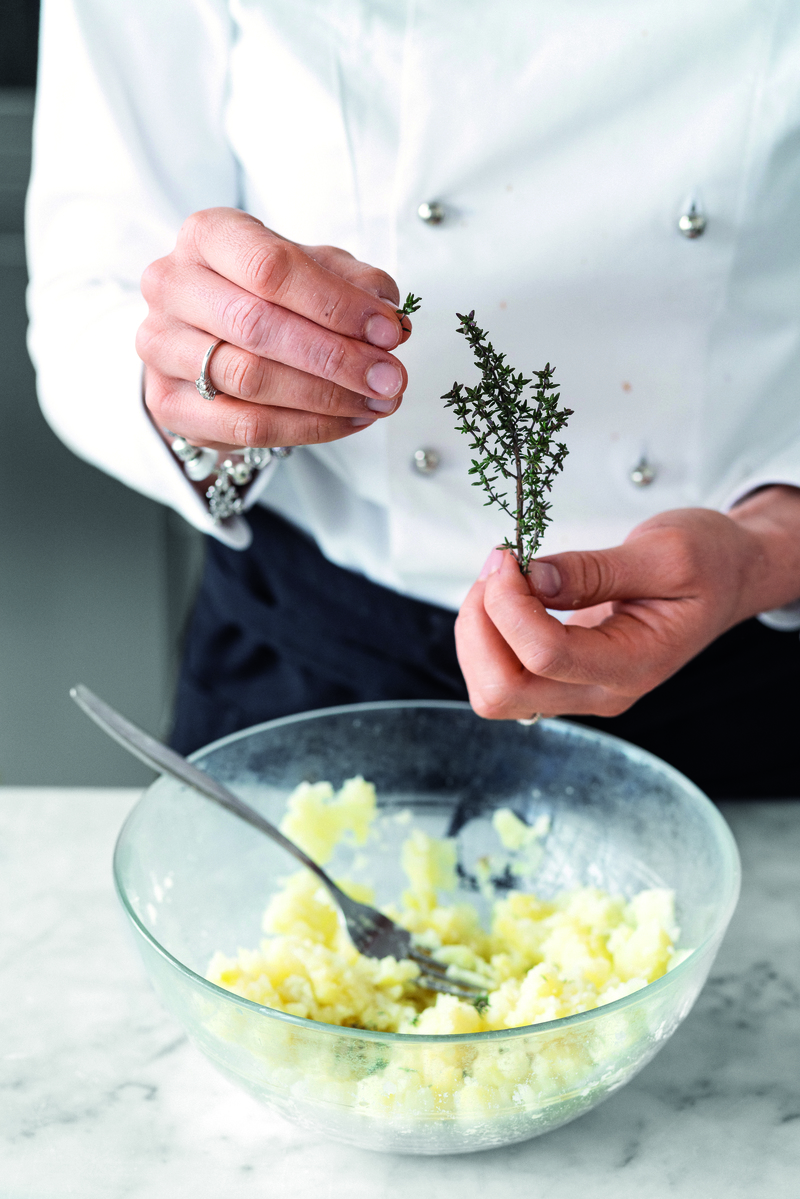 2) Nel frattempo lavate le patate e lessatele in acqua bollente salata. Quando sono cotte, sbucciatele, schiacciatele con una forchetta e conditele con olio, sale e timo fresco. Trasferite una porzione di patate in un coppapasta rotondo, compattatele e toglietelo in modo da formare un disco. Proseguite allo stesso modo formando altri 3 dischi di patate.