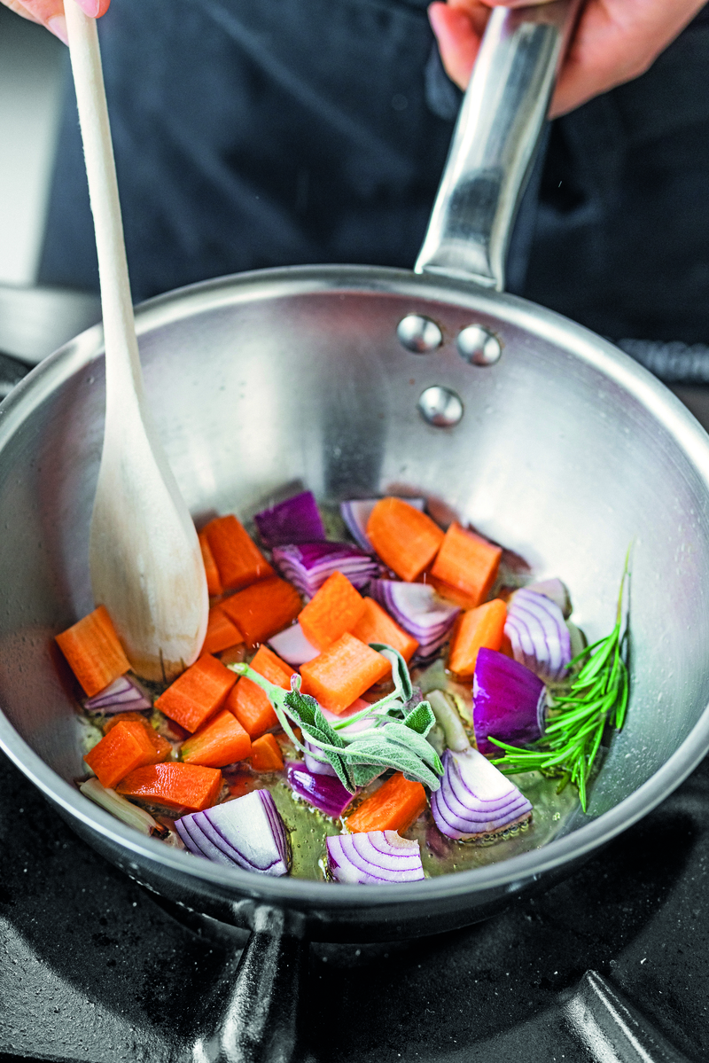 3) Preparate la salsa all'Amarone. Pulite e spellate le carote, sbucciate la cipolla e tagliate tutto a dadini. Fateli soffriggere in padella con un po' d'olio.