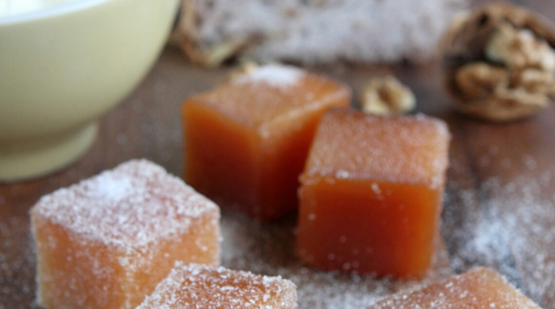 2) Completa e servi la cotognata. Pesa il composto. Versa la purea di mele cotogne nella pentola, aggiungi 800 gr di zucchero per ogni chilo di purea e cuoci a fuoco basso per 40 minuti, mescolando spesso e schiumando se necessario. Spegni la fiamma e mescola ancora il composto per qualche minuto. Versalo poi in uno stampo quadrato a bordo basso foderato di carta forno inumidita e lascialo riposare e raffreddare completamente. Taglia la cotognata a cubotti e passali nello zucchero semolato; servila con mascarpone freschissimo (o altri formaggi non acidi) e con pane fresco alle noci. Puoi conservare i cubotti di cotognata senza zucchero in una scatola di latta.