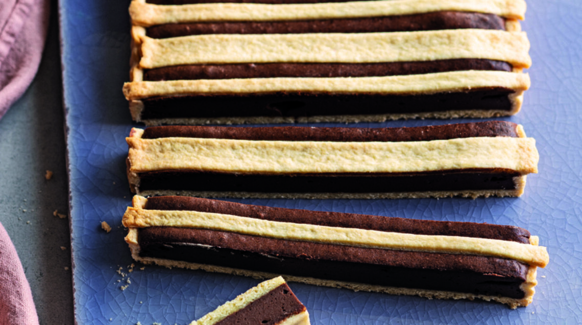 4 Stendete la frolla rimasta sempre a uno spessore di 3 mm e ricavate 5 strisce da 2 cm e altre 5 da 1/2 cm di larghezza e disponetele sul ripieno, alternandole in senso verticale. Cuocete la torta nella parte bassa del forno a 160° per 1 ora e servitela fredda.