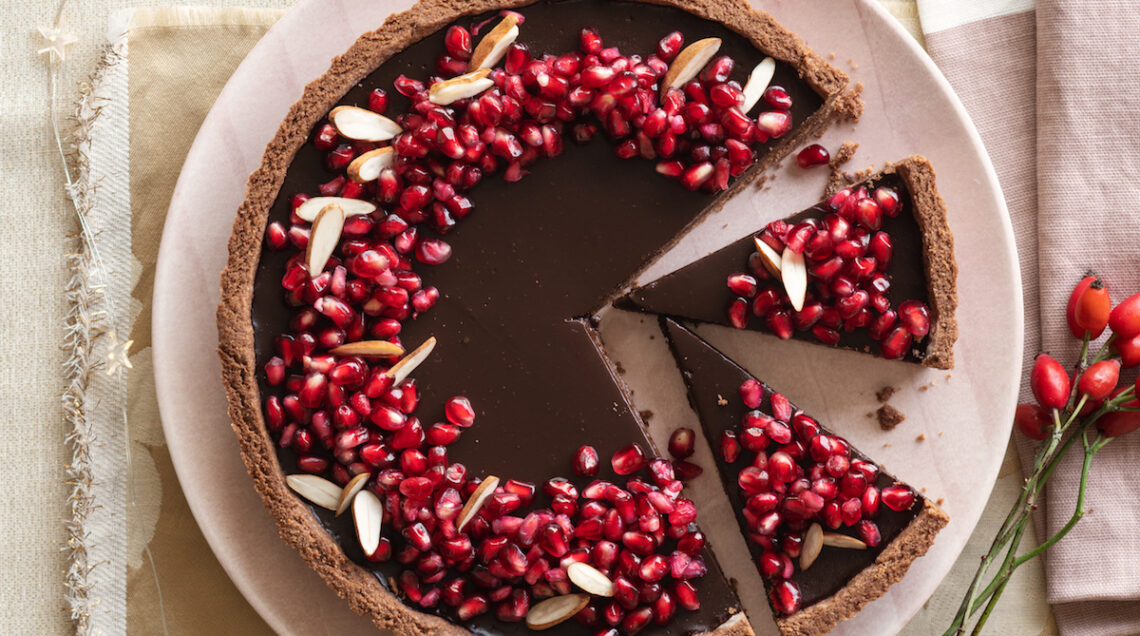 4 Versate la ganache sulla frolla, abbassate la temperatura del forno a 160° e cuocete per altri 30 minuti. Fate raffreddare completamente la crostata e passatela per 1 ora in frigo; quindi decoratela con i chicchi di melograno e le mandorle a lamelle.