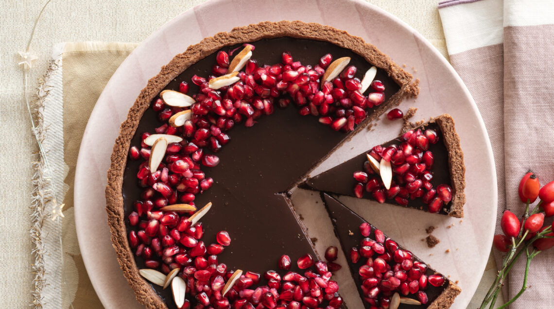 Crostata di farina di riso e mandorle con ganache all’Earl Grey e chicchi di melograno