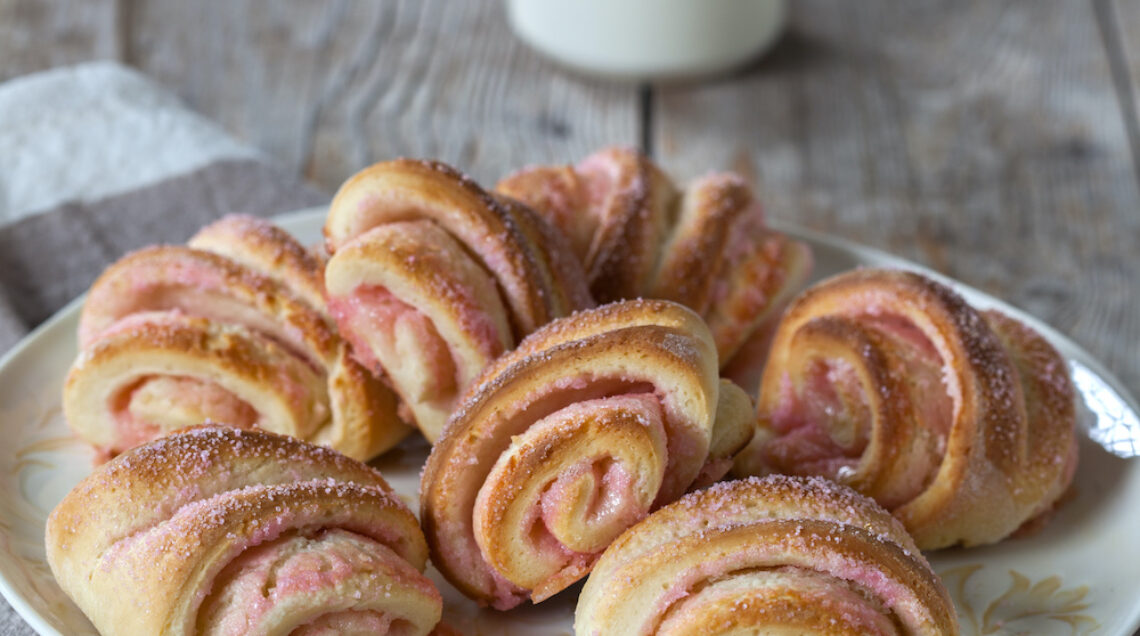 2) Lavorate brevemente l'impasto, stendetelo in una striscia di 40x12 cm, spennellate la superficie con il burro rimasto, morbido, e cospargete con metà dello zucchero alla fragola. Arrotolate la sfoglia nel senso della lunghezza e tagliate il cilindro ottenuto in triangoli. Premeteli con uno stecchino in senso orizzontale, dal vertice alla base, in modo da incidere profondamente i triangoli. Ripetete l'operazione su tutti i triangoli e lasciateli lievitare ancora per 30 minuti.
