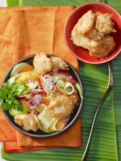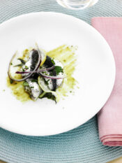 2 Rifilate i bordi dei dischi di sfoglia in modo da ottenere 2 quadrati di 22 cm. Tagliate ogni sfoglia in 4 quadratini di 11 cm di lato, quindi incideteli in diagonale e ricavate da ciascuno 2 triangoli per ottenere 16 triangolini.