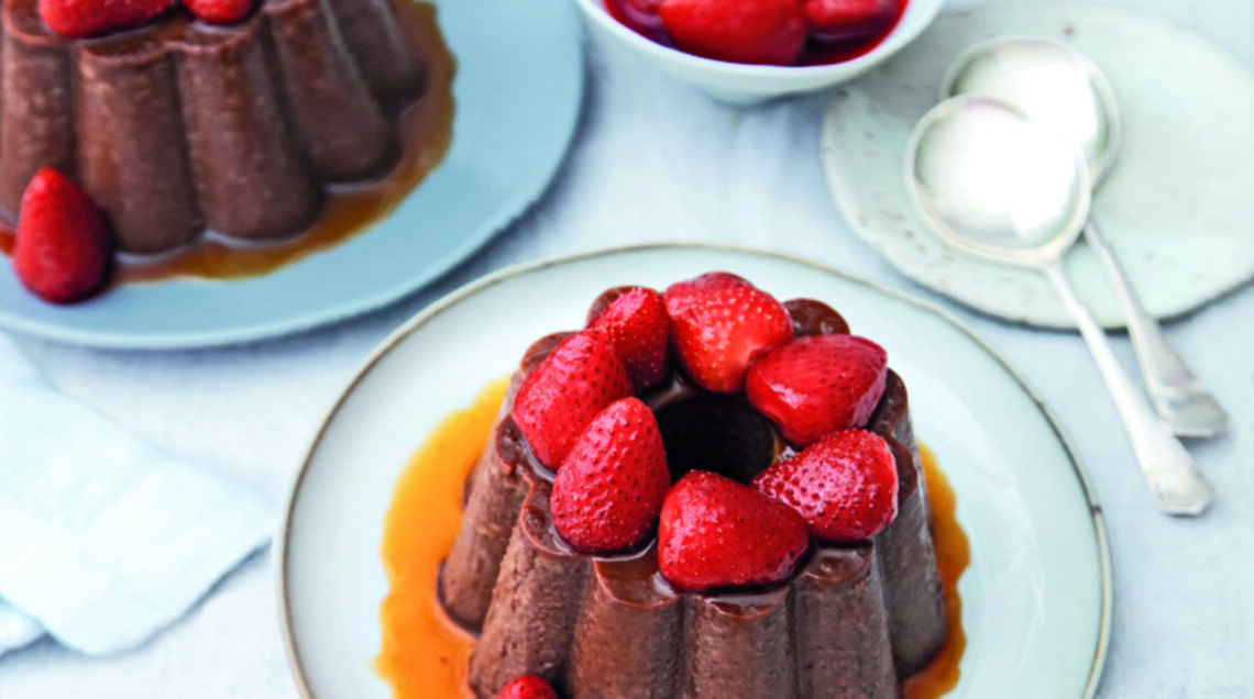 6 Sformate i budini su vassoi o un piatto da portata e trasferiteli nuovamente in frigo. Lavate intanto le fragole, eliminate il picciolo e cuocetele per 3-4 minuti in una casseruola con lo zucchero rimasto. Lasciatele raffreddare e sistematele sui budini con il loro sciroppo al momento di servire.