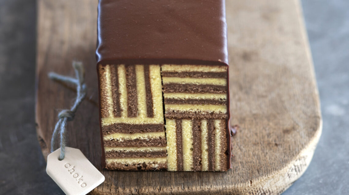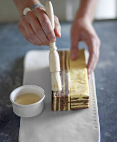 Coprite con uno strato di composto al cacao di uguale spessore e cuocete per lo stesso tempo. Procedete con altri strati, alternando i colori, fino a terminare i 2 composti (dovreste ottenere 4 strati di ciascun colore). Fate raffreddare.