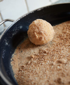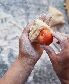 Trasferite l'impasto sulla spianatoia infarinata e tagliatelo prima a grosse fette e poi in tocchi regolari (circa 18, tanti quanti le albicocche). Prendetene uno, appiattitelo leggermente, avvolgetevi 1 albicocca e richiudete, schiacciando leggermente la pasta tra i palmi delle mani fino a ottenere un grosso gnocco. Continuate nello stesso modo fino ad esaurire gli ingredienti.