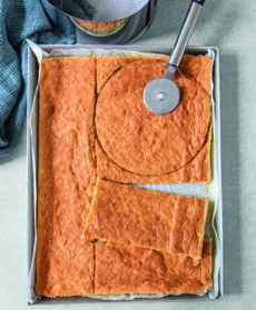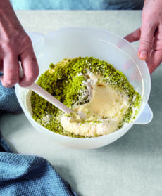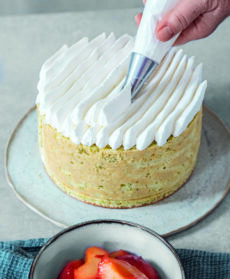 Per la pasta biscuit, sgusciate le uova separando i tuorli dagli albumi; montate i primi con 3/4 dello zucchero e un pizzico di sale fino a ottenere un composto spumoso. Montate gli albumi e con le fruste in movimento unite lo zucchero rimasto. Continuate a montare fino ottenere una meringa soda e incorporatela delicatamente al composto di tuorli. Unite i pistacchi in polvere e la farina setacciata e mescolate con una spatola.