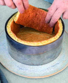 Disponete l'anello su un piatto e rivestite il fondo con il disco e il bordo con le strisce di pasta biscuit.