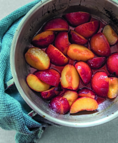 Lavate le prugne, tagliatele a metà, snocciolatele e cuocetele per 5-6 minuti con lo zucchero e il succo del limone, lasciatele raffreddare e, a piacere, sbucciatele.