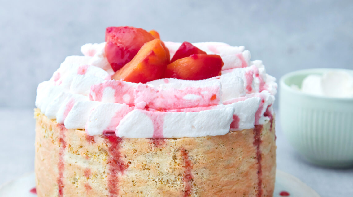 La torta charlotte è normalmente realizzata con crema bavarese e savoiardi: in questa versione alla vaniglia gli ingredienti principali sono invece le prugne sciroppate