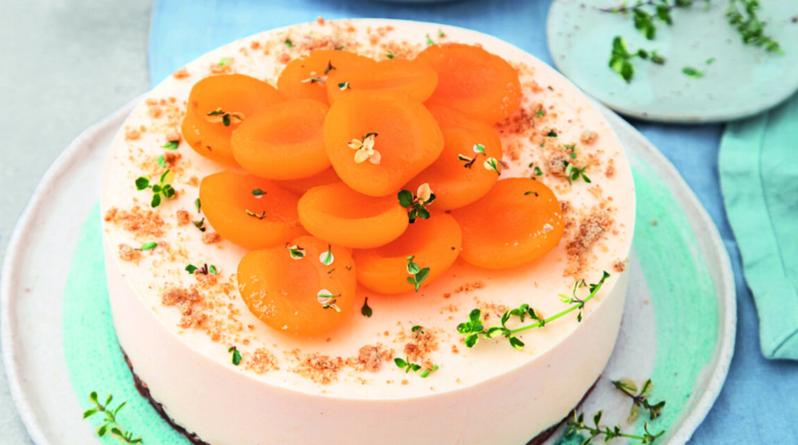 4  Versate la mousse nello stampo preparato e fate riposare in frigo per almeno 6 ore. Rimuovete il bordo dello stampo e trasferite la torta sul piatto di servizio. Decorate con le albicocche tenute da parte, la pasta sablé sbriciolata e il timo cedrato.
