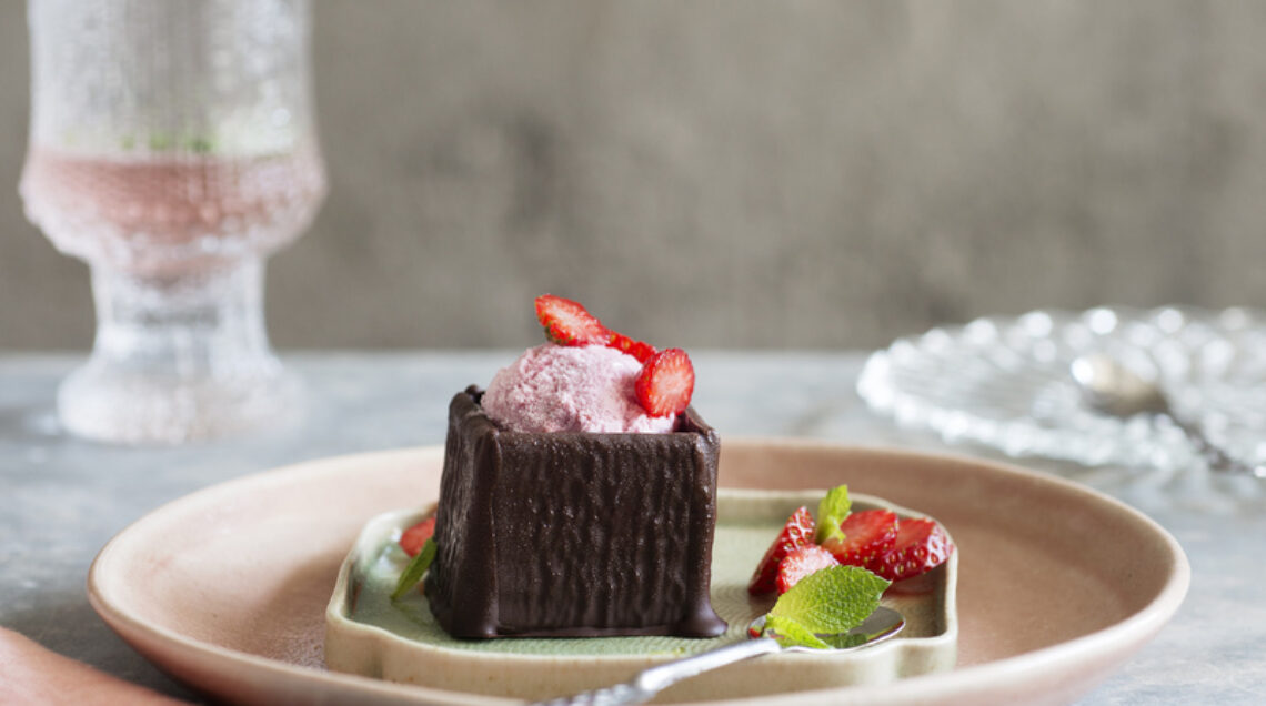 Il gusto inconfondibile del cioccolato incontra la freschezza del gelato alla fragola: sentori di menta rendono il boccone gourmand