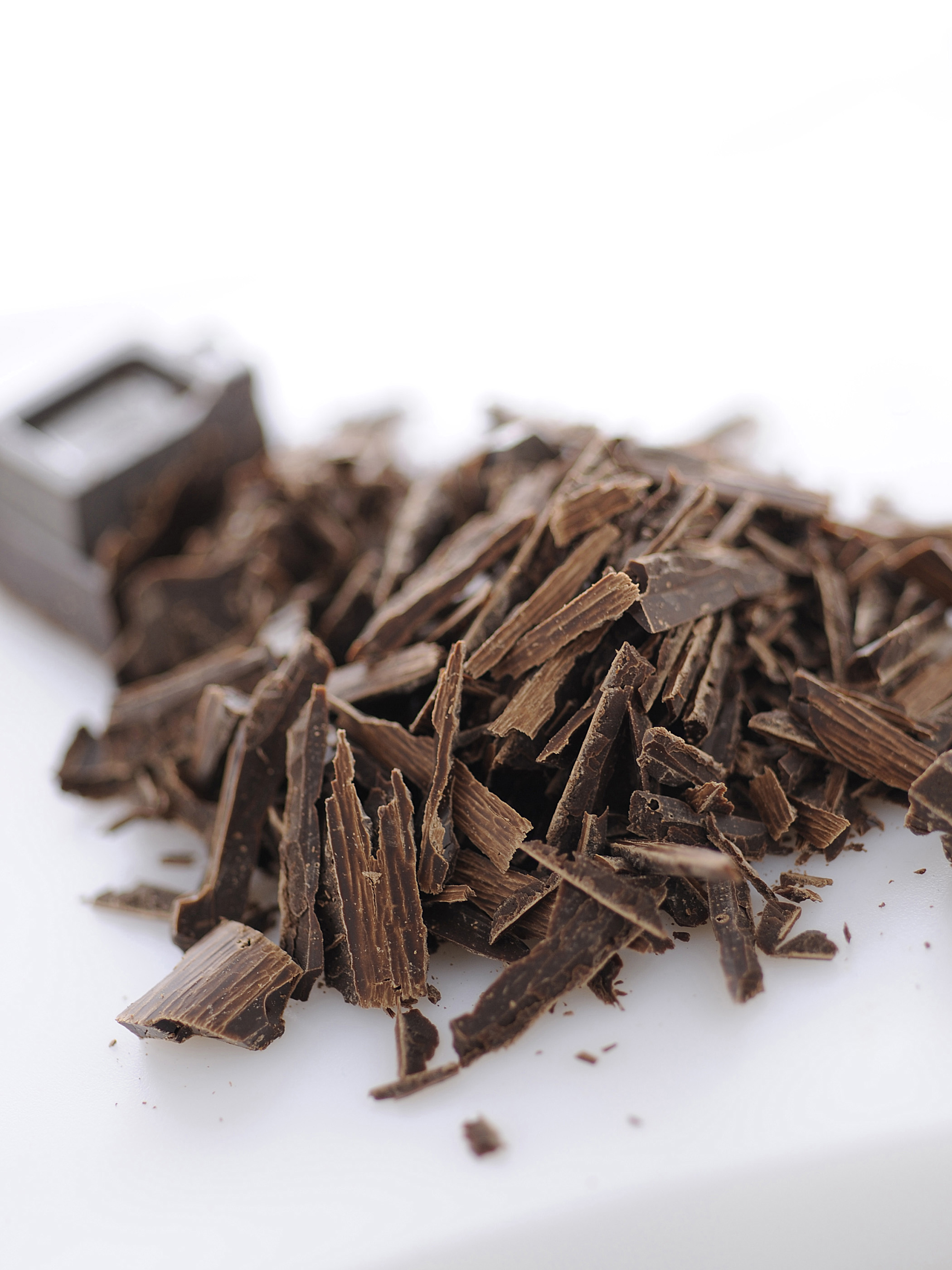 3) Adesso trita il cioccolato ( l’ingrediente base della ricetta bavarese cioccolato e menta ) e metti a bagno in acqua fredda i fogli di gelatina.