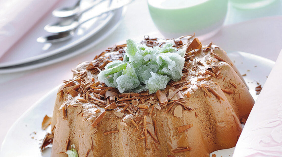 1) Per rendere la presentazione della bavarese ancora più elegante, prendi 20 foglie di menta, passale nell’albume che avrai tenuto da parte, poi nello zucchero e infine adagiale delicatamente ad asciugare in un piatto. Una volta sformata la bavarese, decoratela con la menta brinata e con scaglie di cioccolato.