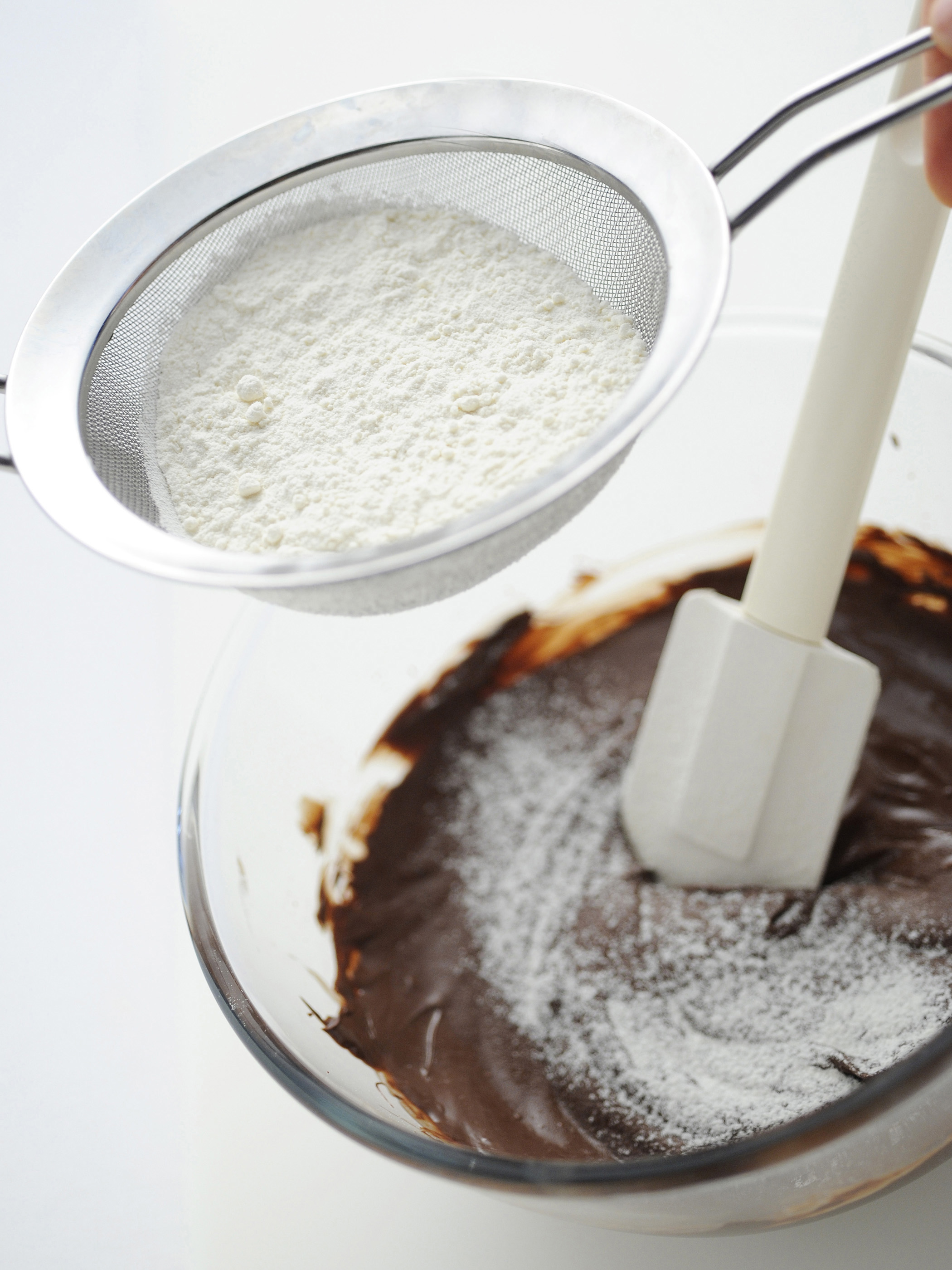 3) In una terrina metti farina e lievito setacciate insieme, aggiungi il burro e il cioccolato, le uova sbattute, il latte e i semi di vaniglia che hai estratto dal baccello.