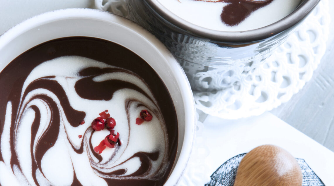 5) Versa la cioccolata al pepe rosa in tazza, alterando i colori, e creando delle decorazioni con l’aiuto di uno stecchino. Gustala subito.