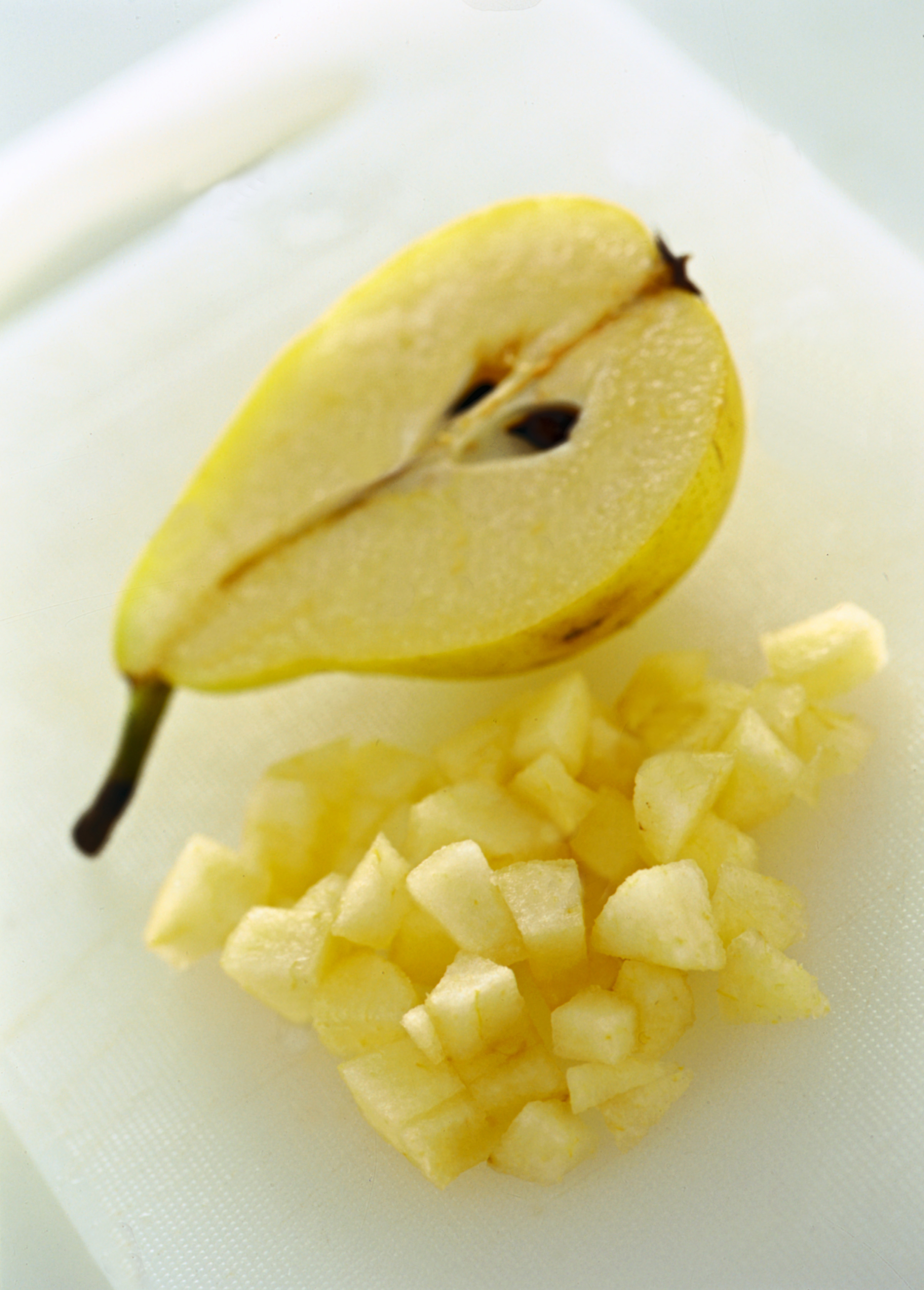 3) Sbuccia 3 pere, riducile a dadini elimina il torsolo e irrorale con il succo del limone per evitare che anneriscano. Trita le noci e aggiungile insieme alle pere all'impasto precedente.
