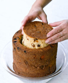 Capovolgete il panettone e incidetelo con un taglio circolare, a 2 cm dal bordo, affondando il coltello quasi fino in fondo. Rimettetelo in piedi, infilate la lama sotto la calotta e muovetela delicatamente, in modo da staccare il cilindro interno, senza staccare la calotta. Rovesciatelo nuovamente, sfilate il cilindro e tagliatelo a dischi di circa 2 cm di spessore. Distribuite sul fondo del panettone rovesciato qualche cucchiaio di crema al mascarpone, sovrapponete un disco di panettone, spalmatelo con altra crema e procedete fino a chiudere il panettone con l'ultimo disco (quello con la crosticina esterna). Compattate bene il tutto con le mani. Avvolgete il dolce in un foglio di alluminio e trasferitelo in frigorifero.