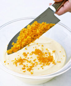Ricavate la scorza dell'arancia: tritatene un cucchiaio e tagliate il resto a filetti. Spremetene il succo. Montate i tuorli con lo zucchero ottenendo un composto spumoso, unite il mascarpone, 2-3 cucchiai del succo, la scorza tritata e mescolate, finché diventerà una crema soffice.