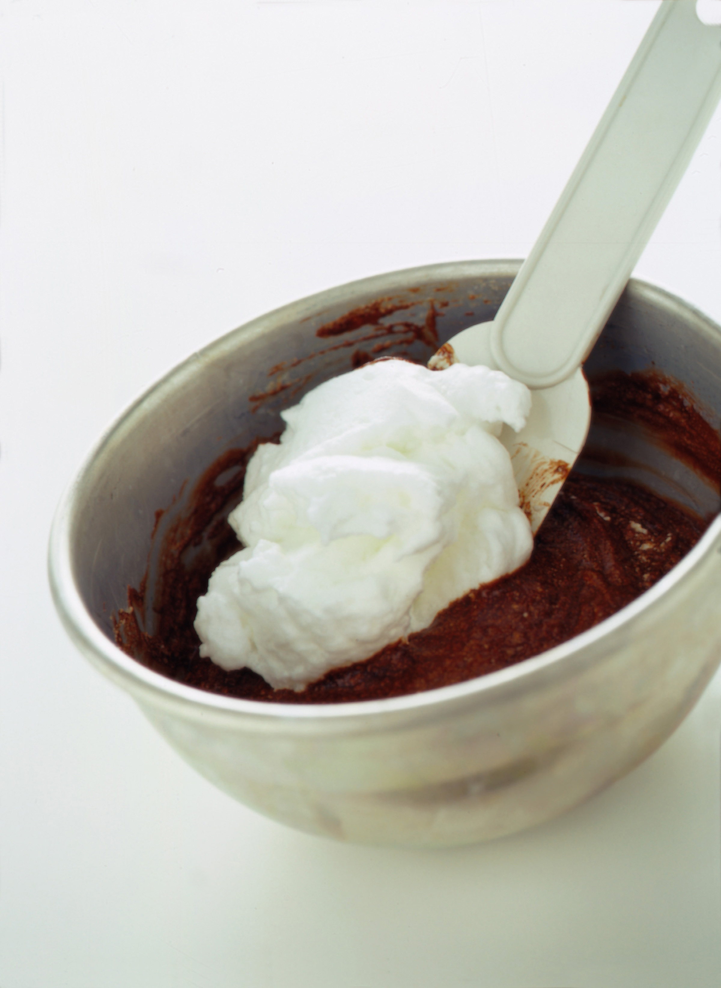 Componete la doppia mousse incorporando circa un quarto degli albumi montati a neve alla salsa di cioccolato. Quando gli ingredienti si saranno amalgamati, incorporate delicatamente il resto degli albumi, con movimenti dal basso verso l’alto.