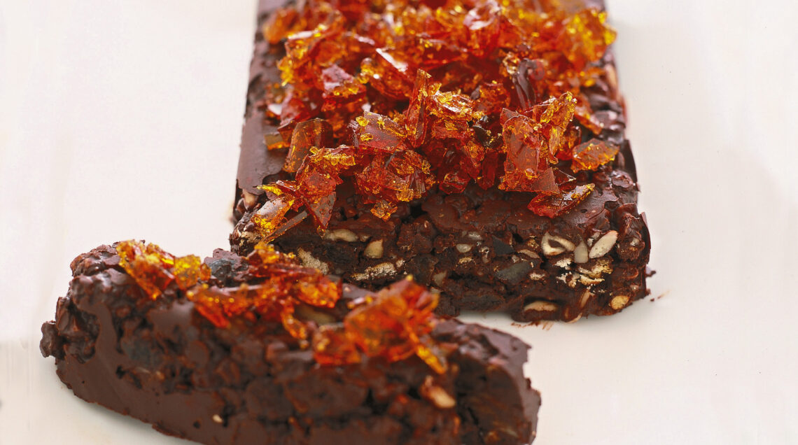 1) Per la ricetta della mattonella di cioccolato croccante occorre spezzettare e tritare il cioccolato e poi scioglierlo in un recipiente a bagnomaria insieme al burro e a 30 g di zucchero avendo accortezza di mescolare continuamente finché il composto non diventa cremoso. Allo stesso modo trita in modo grossolano anche i biscotti mescolandoli con nocciole tritate grossolanamente, pinoli e canditi, aggiungendovi il vino passito e mescolando il tutto.