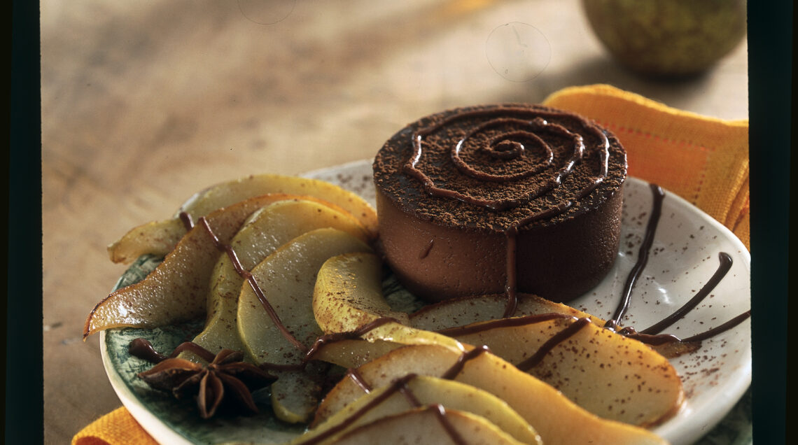 e disponetevi accanto gli spicchi di pera leggermente accavallati. Spolverizzate con il cacao e servite. Se vi piace, decorate con fili di cioccolato, fondente o al latte, fuso e qualche stella d'anice.