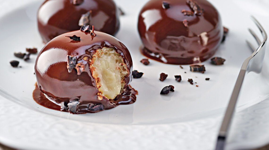 Cuocete i bigné in forno a 180° per 5 minuti. Nel frattempo, lavorate la crema con una frusta per ammorbidirla. Sfornate i bignè e farciteli con la crema, con una tasca da pasticciere, finché sono ancora caldi. Tuffateli nella glassa al cioccolato e adagiateli in un piatto da portata o nei piattini singoli decorando, se vi piace, con cioccolato fondete a scagliette.