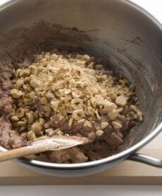 Amalgamate infine lo zucchero a velo, le nocciole e i biscotti.