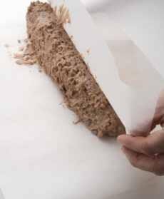 Per formare il rotolo facilmente, prima di trasferire il composto sulla carta da forno potete ungere il foglio spennellandolo con poco olio di semi. Dopo aver sigillato il pacchetto, fate rotolare il salame sul piano lavoro per 2-3 volte, per compattarlo bene.
