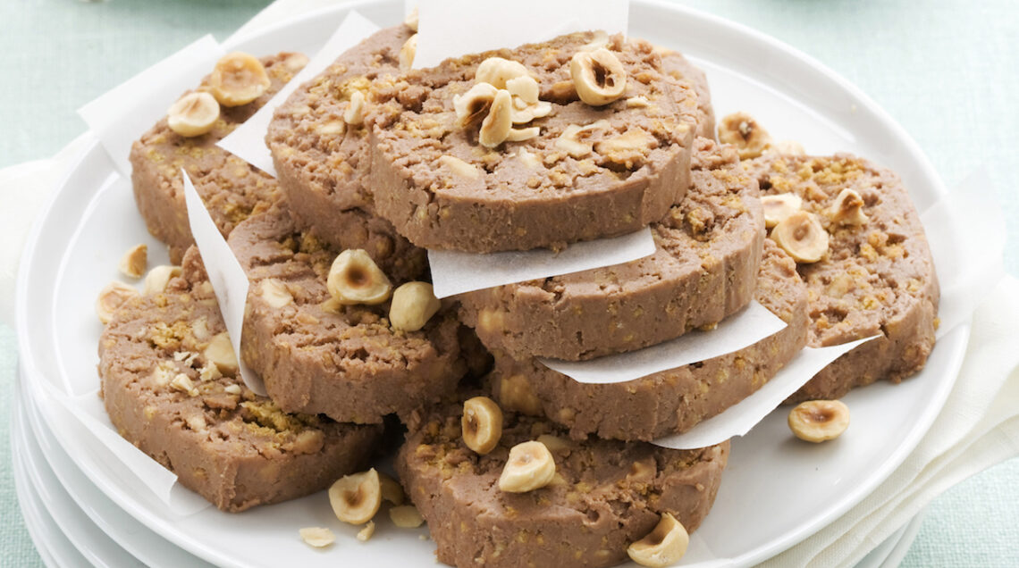 Un dolce solitamente preparato con biscotti secchi, cioccolato e burro: qui vi proponiamo una versione più leggera, a base di ricotta, o altro formaggio fresco spalmabile, cioccolato e croccanti nocciole. Potete usare anche altra frutta secca, come noci e mandorle.