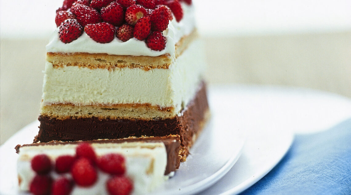 4) Usa una frusta per montare il composto di cioccolato bianco e poi versalo sulla pasta. Coprilo con una altro rettangolo, quindi versa il cioccolato fondente, infine chiudi con il terzo triangolo. Metti il dessert a riposare in frigorifero per 3 ore.