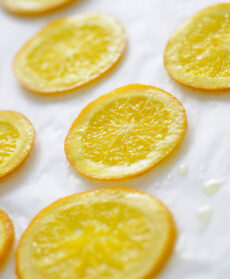 Tagliate le arance a rondelle sottili (scartate le calotte grattugiate) e cuocetele in una padella con lo zucchero rimasto e l'acqua necessaria a coprirle un po', finché risultano lucide e candite. Trasferitele su carta da forno a raffreddare e conservate lo sciroppo.