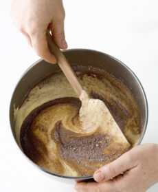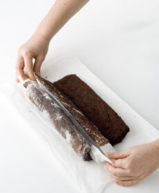 Togliete il biscuit dal forno, lasciatelo intiepidire, quindi arrotolatelo sul lato lungo con la sua carta e fatelo riposare. Intanto preparate la ganache: riunite il cioccolato e il burro in una ciotola, portate la panna al limite dell'ebollizione e incorporatela. Fate riposare per 5 minuti, unite il whisky, lasciate raffreddare per 10 minuti e montate con le fruste fino a ottenere una crema densa.